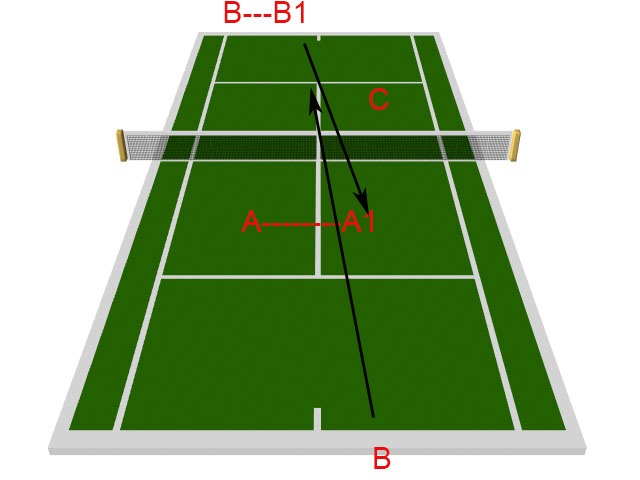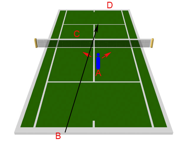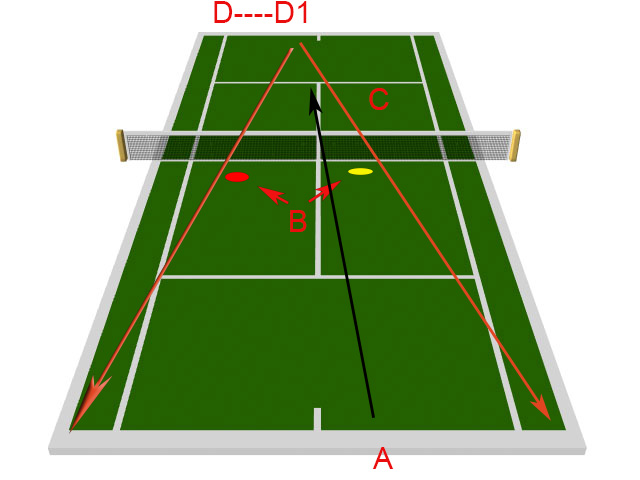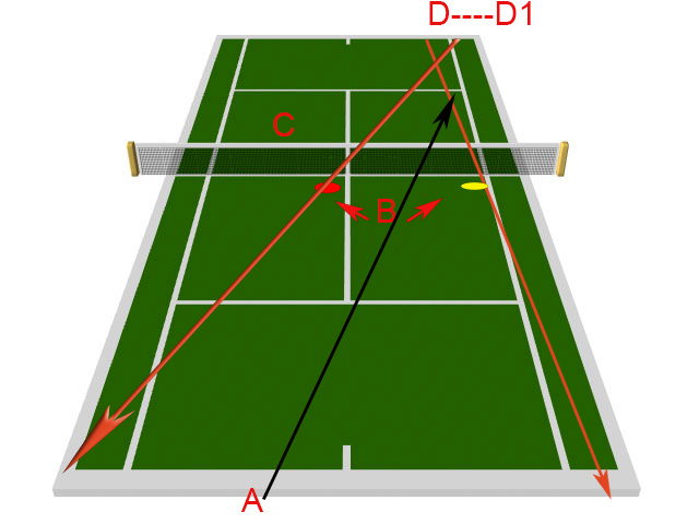 - Cayer podaje , że zawodnik przy siatce robi 2 kroki do przodu przed linię serwisową w przypadku drugiego serwisu. Możliwości kątowe zawodnika (zawodnik A) po swoim serwisie są takie , że zawodnik A powinien ustawić się na dwusiecznej (kolor niebieski-A1) możliwości kątowych zawodnika returnującego D. Możliwości kątowe zawodnika D oznaczone są liniami pomarańczowymi. W tej sytuacji nie uwzględnia się pozycji zawodnika B. Chodzi tylko i wyłącznie o możliwości kątowe na połowie zawodnika A. Bardzo często zawodowcy wykorzystują w takich sytuacja swoją mocną broń czyli odwrotny forehand.