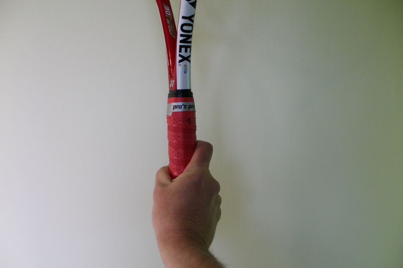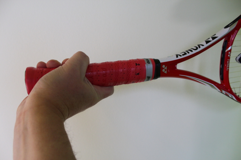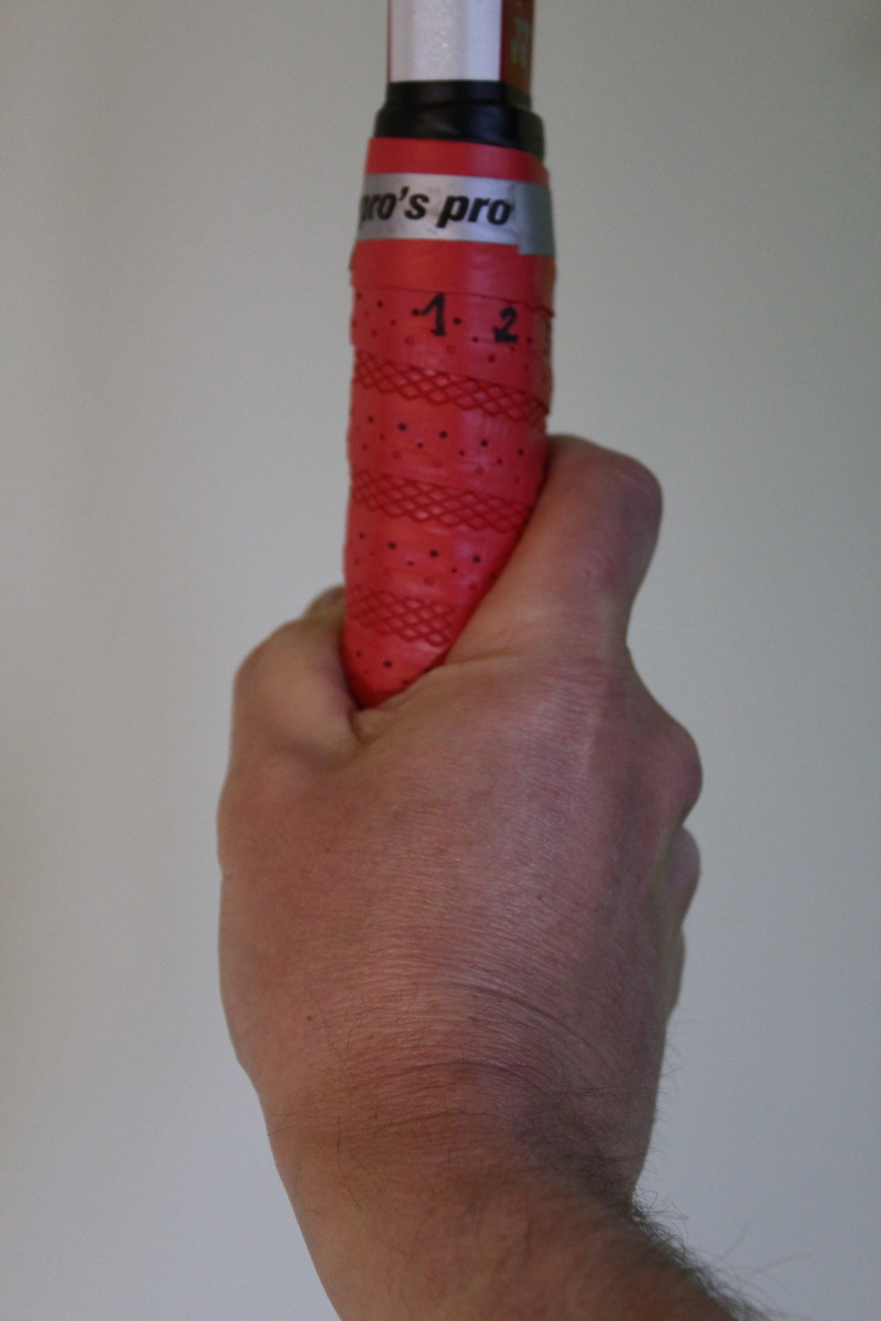 W przypadku rakiety ustawionej płaszczyzną strun prostopadle do ziemi ,kostka stawu śródręczno-paliczkowego palca wskazującego powinna znajdować się na płaszczyźnie numer 3 (patrz fot.) . Na zdjęciu poniżej z zaznaczonym znaczkiem „X” , kostka dłoni która ułatwia nam określenie położenia dłoni na uchwycie rakiety.