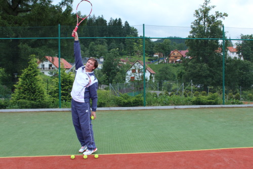 25.Występuje silna korelacja pomiędzy wysokością uderzenia piłki a efektywnością serwisu. Początkujący uderzają z reguły bez całkowitego wyprostu ramienia uderzającego .Ma to wpływ na ograniczony wymach .