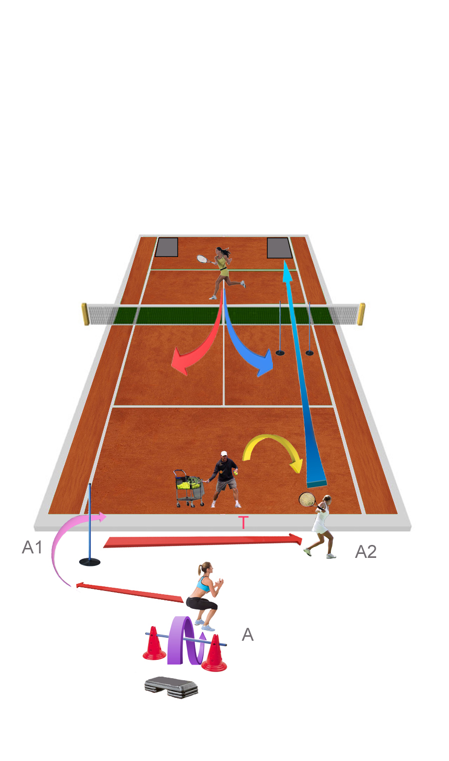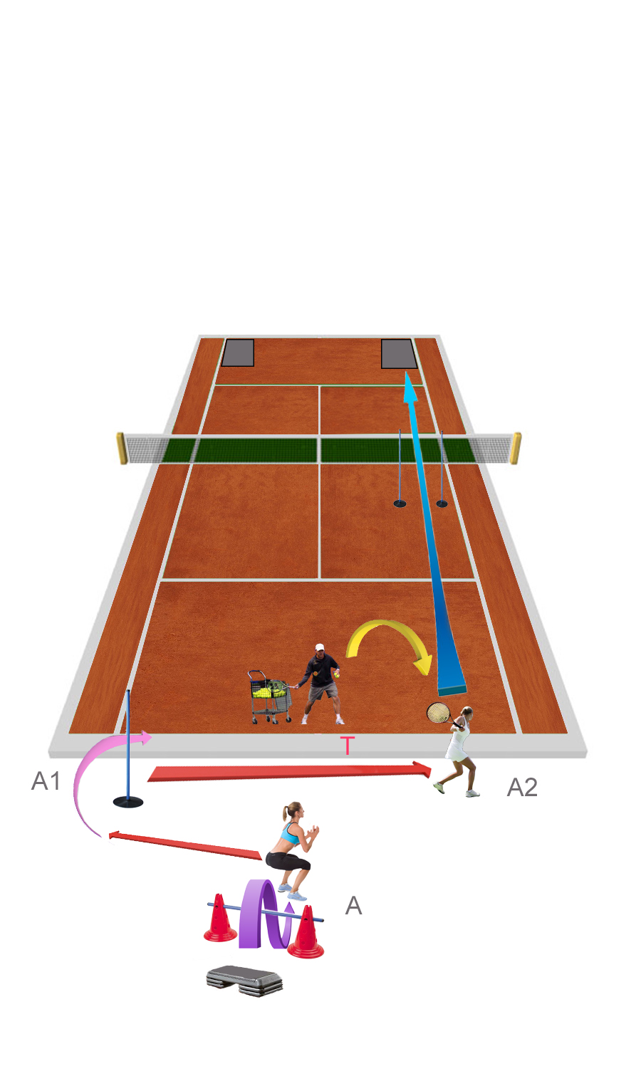 - Zawodnik A na siatce a zawodnik B ustawia się za linią końcową. Trener z drugiej strony kortu dogrywa loby na zawodnika A przy siatce (krótkie i długie loby). W tym czasie zawodnik B wybiega do przodu i próbują się bronić razem z A przed uderzeniami trenera.