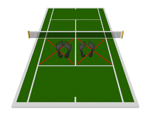 - W przypadku serwisu T (do środka kortu) markery przesuwają się o 4 kroki w lewo. W takiej kombinacji zawodnik B wykonuje jeden krok więcej w kierunku kara partnera w przypadku przebiegania.Cayer twierdzi , że tak naprawdę gra na siatce odbywa się na powierzchni 32m2 kortu.